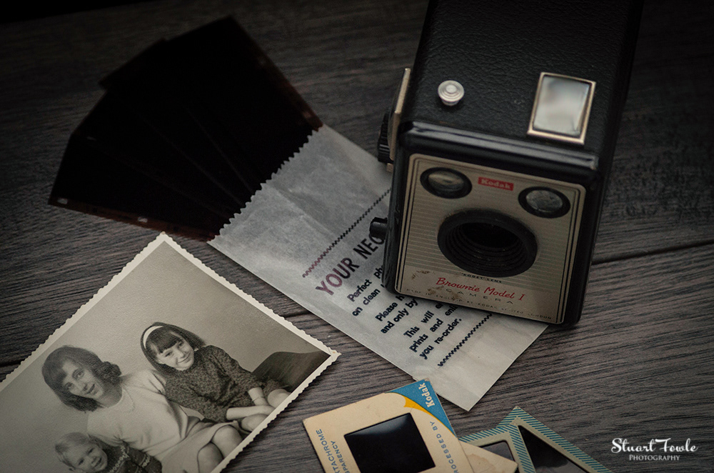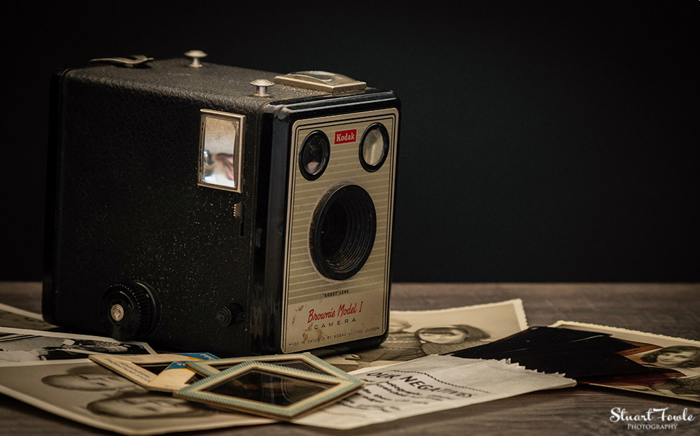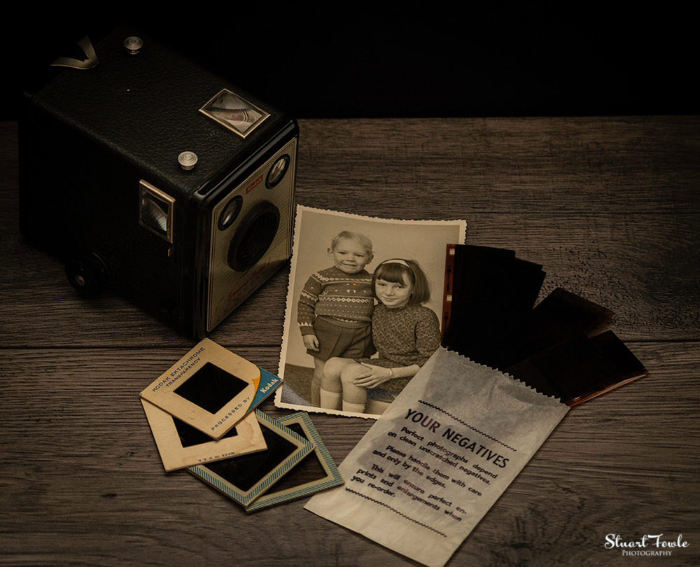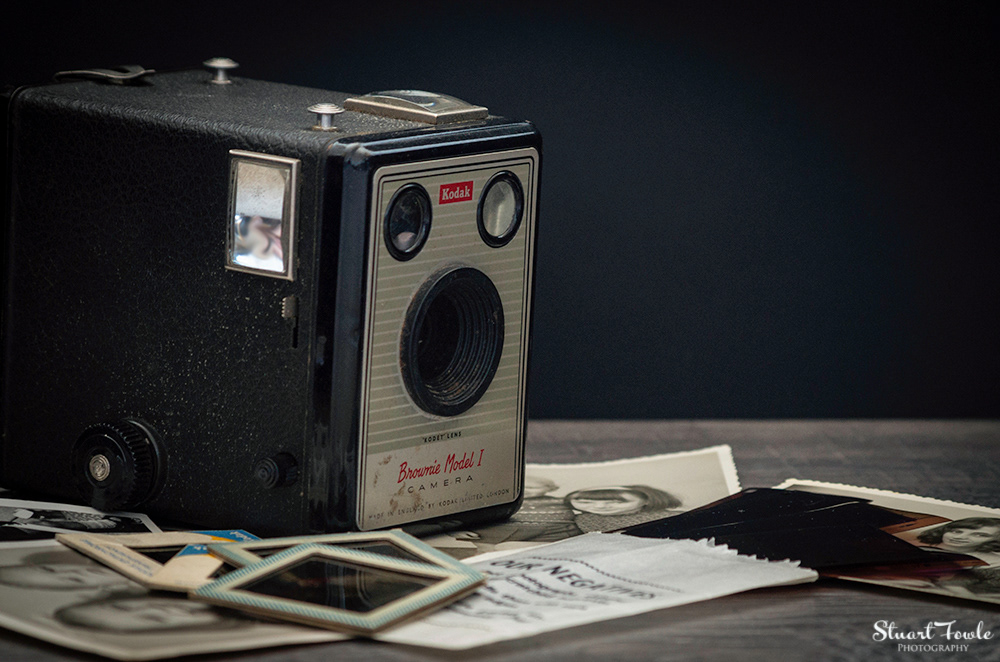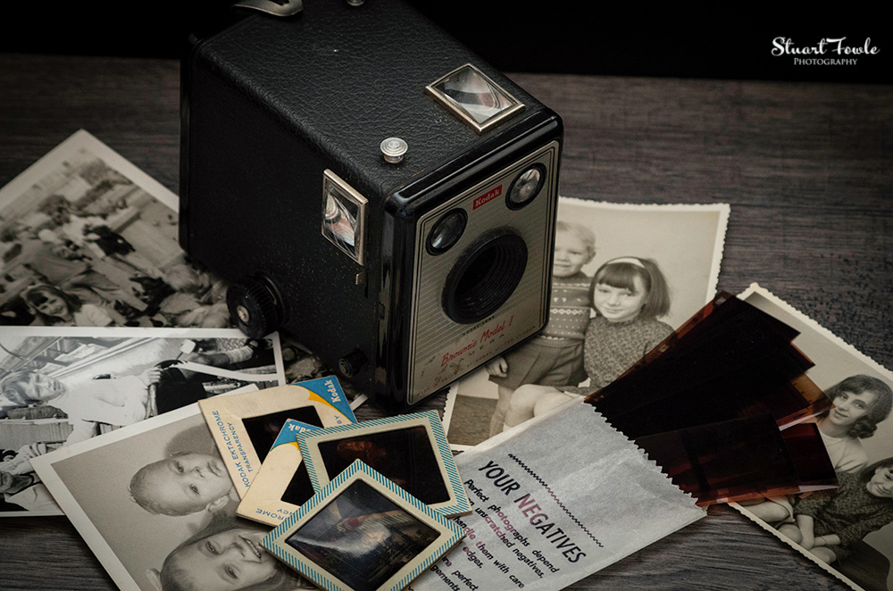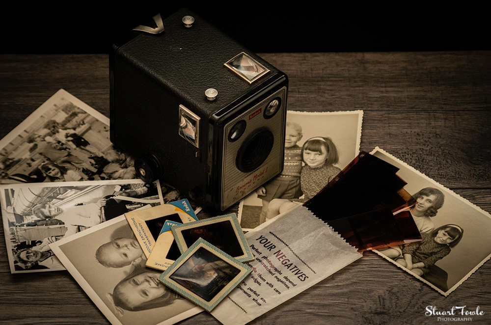 A selection of photos of an old Box Brownie camera and some old family photos and negatives etc.