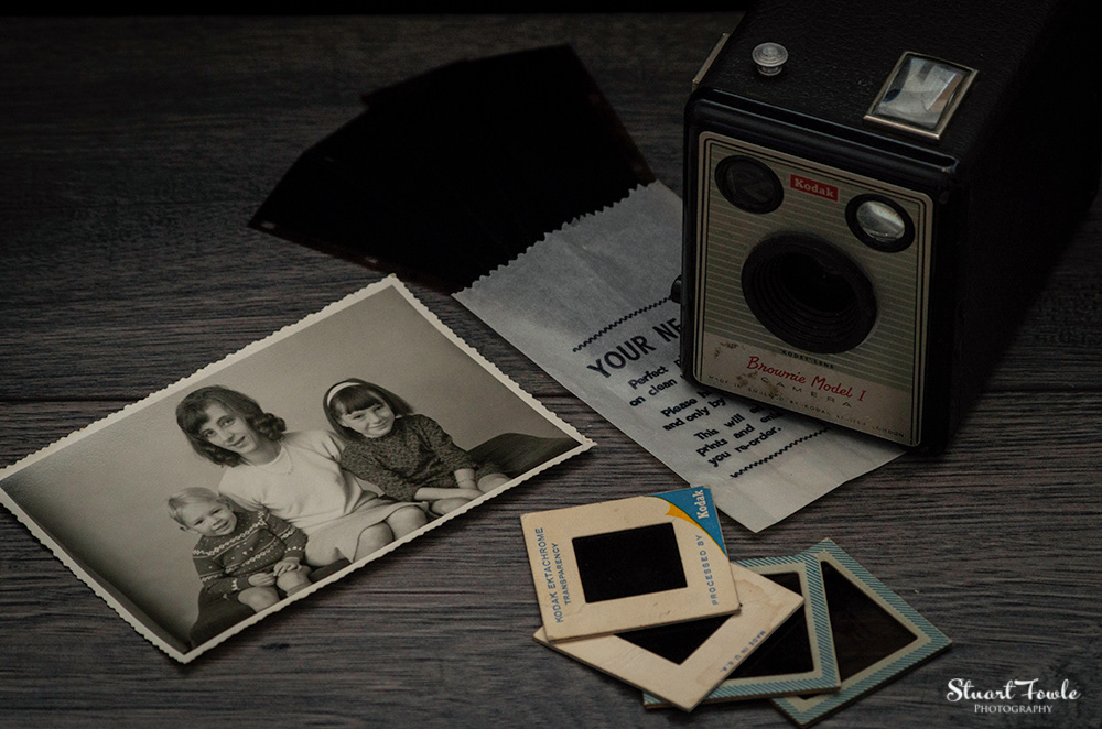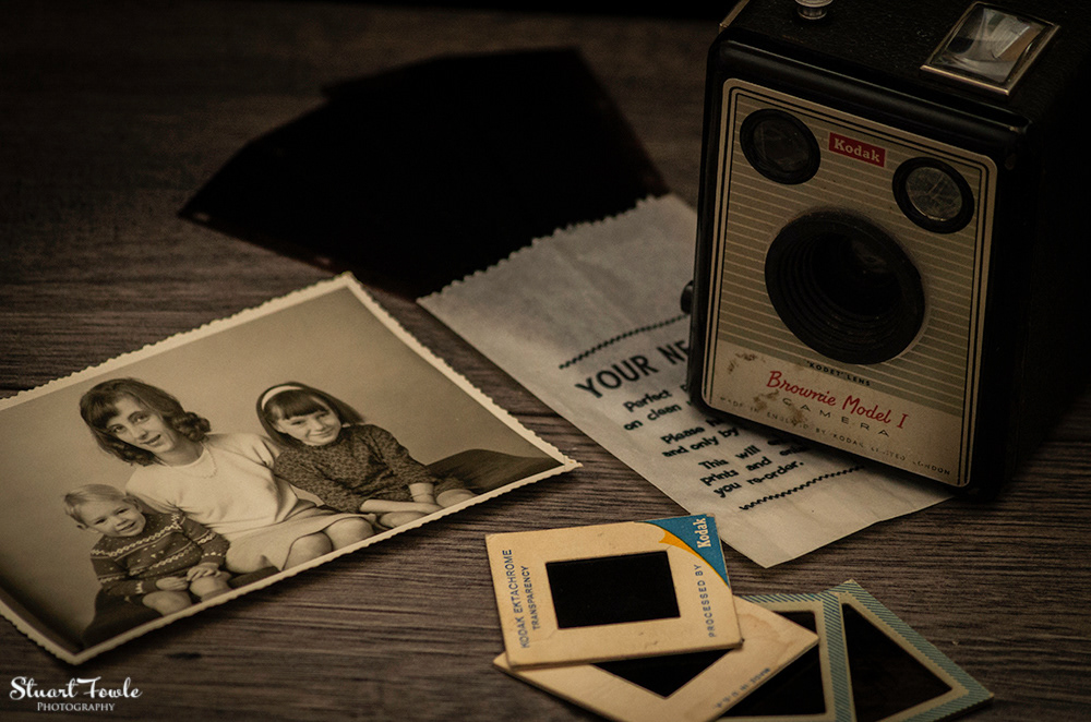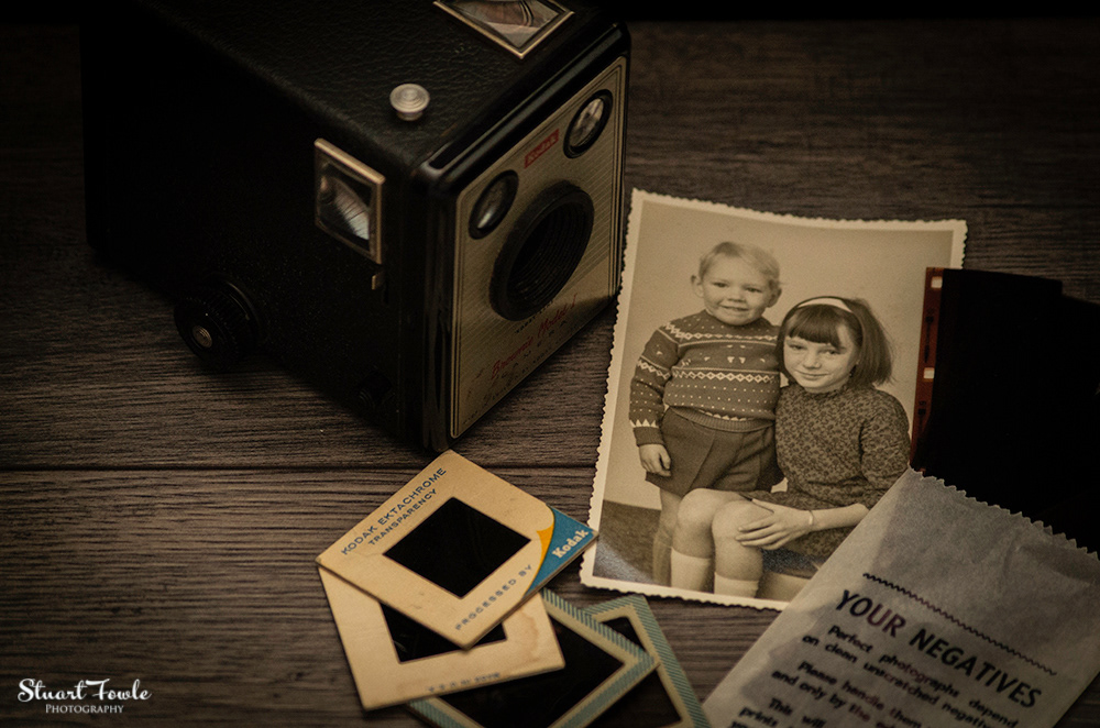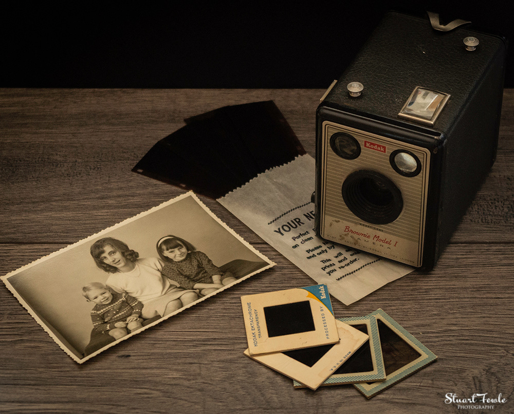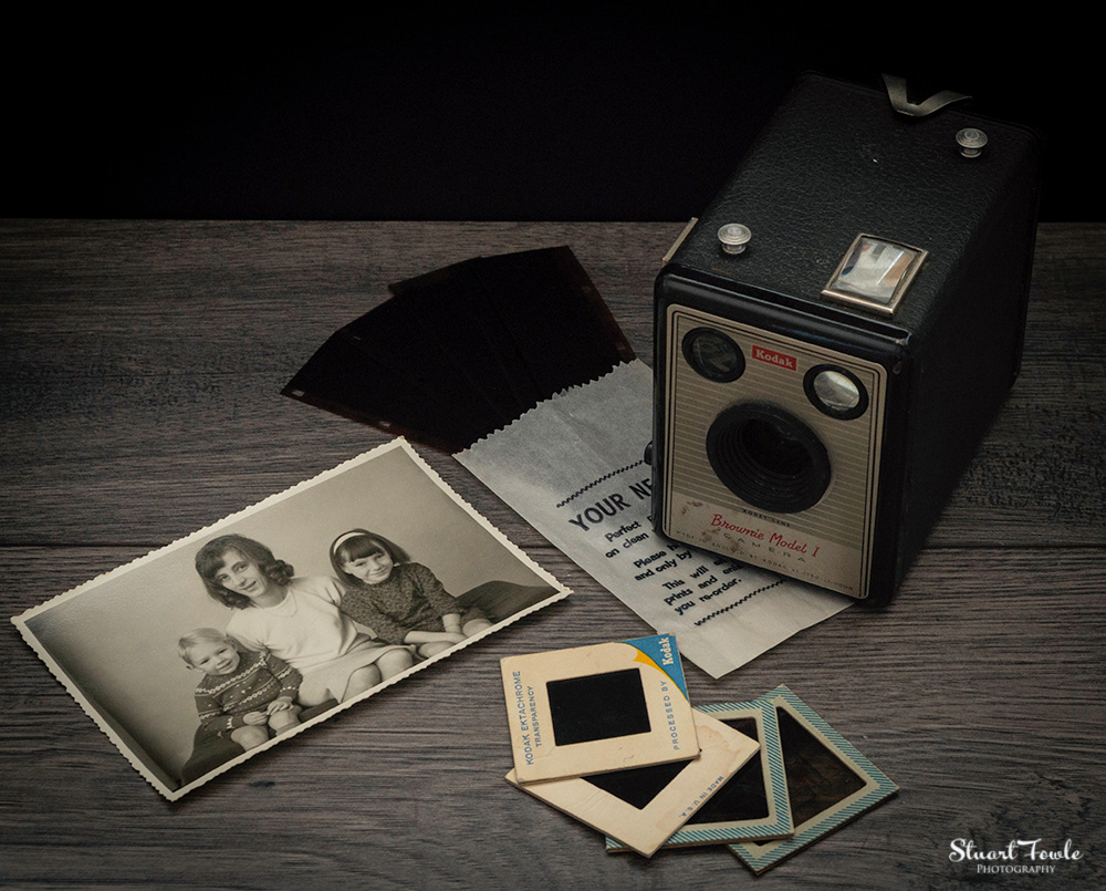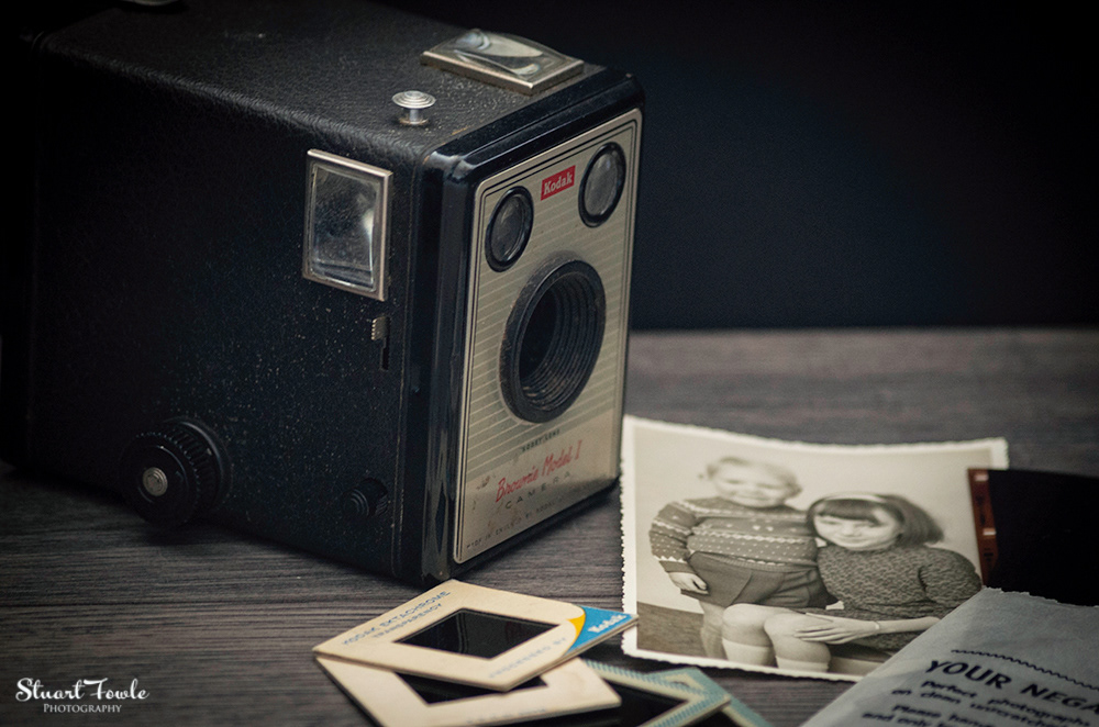 A selection of photos of an old Box Brownie camera and some old family photos and negatives etc.